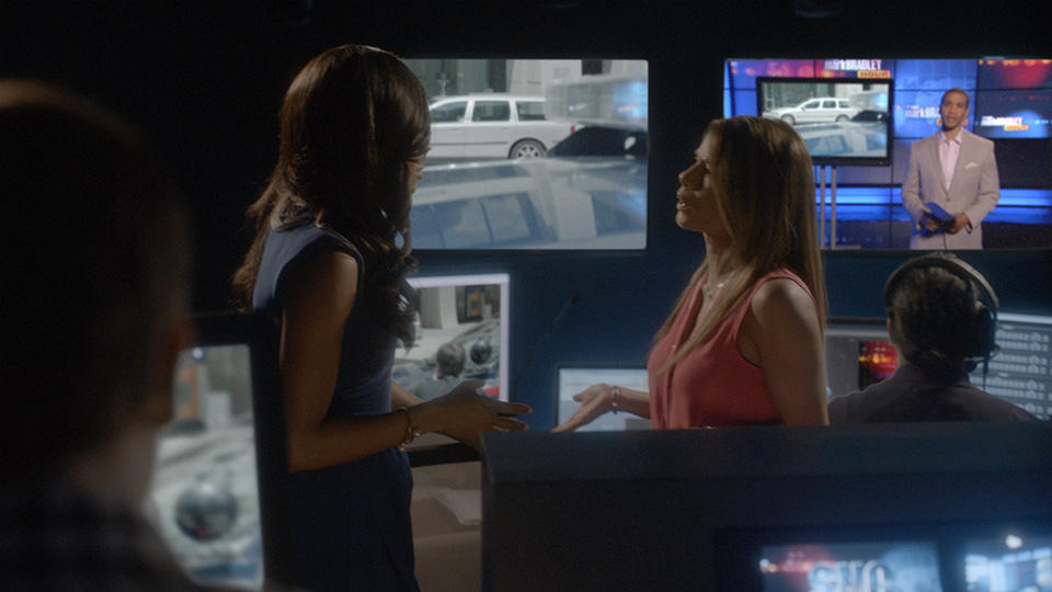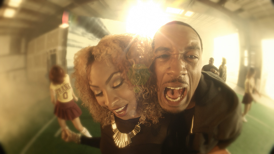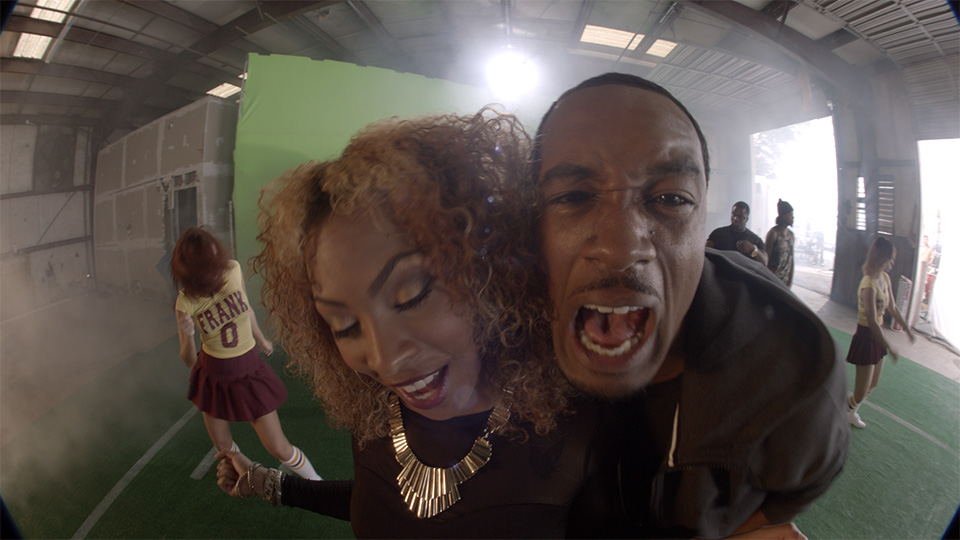 This scene was from a music video shown within the show The Game. It was one of the more challenging set of scenes that we have had to work on in awhile. The green screen was meant as a monitor of football scenes.